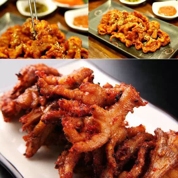 辣凤爪,韩国有名的辣味美食!分为烤辣凤爪和辣炒凤爪。而且辣凤爪还分为有骨和没骨的。很多时候看韩国人在鸡爪店里,带着塑料手套拿着鸡爪吃的不亦乐乎。虽然韩国的辣凤爪特别的辣,但是味道很好,成为韩国人极力推荐的一种韩国美食。
