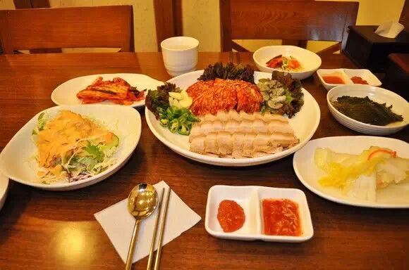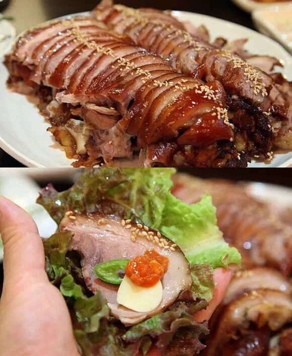 韩国的猪脚吃法跟我们中国不太一样,很多时候猪脚都是已经被切成片状,跟生菜,大酱,大蒜等一起包起来吃的。猪脚的做法种类也分为,碳烤,熏制等。同时猪脚也成为韩国人夜宵TOP10中的一员!