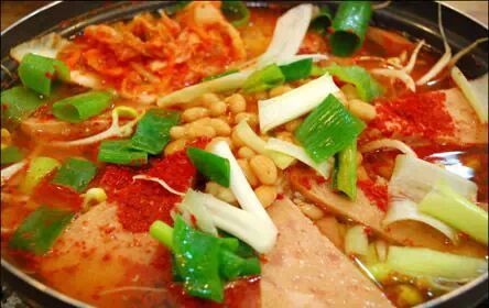 部队汤,这道菜融合了火腿,甜豆,香肠,豆腐,年糕,辣白菜,粉丝等韩式西式的材料,成为韩国一种最独特的韩西式美食!而且还可以加入拉面的面饼,不但量大,而且美味。