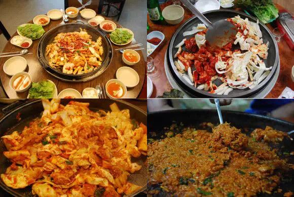 辣炒鸡排,也是一种韩国特有的美食。用鸡胸肉,年糕,洋白菜,大葱等蔬菜配上辣椒酱料炒制而成的。一般这道菜只可以点两人份以上。而且韩国人还有一种特有的吃法,在辣炒鸡排吃的差不多的时候,在烤盘上放入米饭,碎紫菜,芝麻,香油等一起炒来吃。