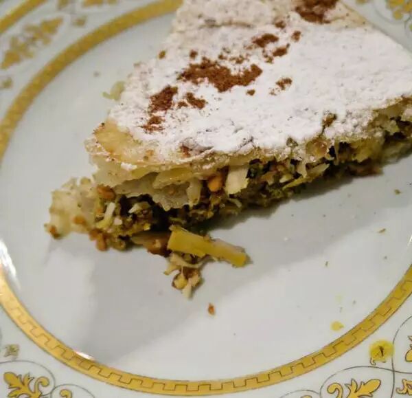 这道菜是摩洛哥节日必备,是一种精心制作的肉饼,制作手续很麻烦。做法是先用香料、奶油炖煮鸡肉,鸡肉炖熟后切碎,而杏仁炒熟后捣碎,再加入洋葱与鸡蛋小火焖煮,最后把鸡肉、杏仁、洋葱、鸡蛋、糖和各种调味料混在一起裹进饼皮里,然后放入烤箱烘烤至焦脆金黄,再在表面撒上一层糖和肉桂粉即可。