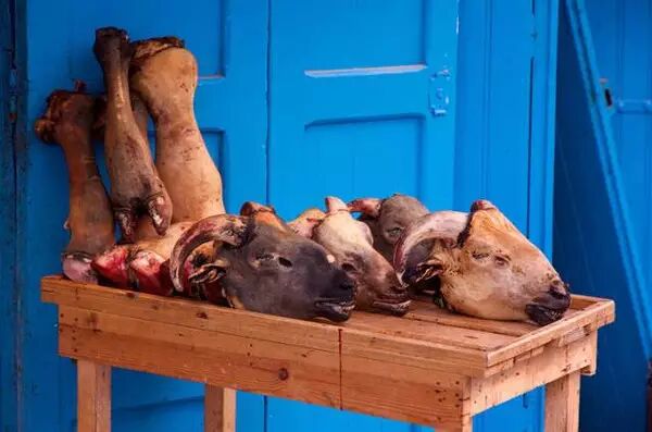 在宰牲节的时候,人们会屠杀一些羊,把它们的头用来蒸煮几个小时,然后配着孜然,盐,辣椒来享用。听说脸颊肉和舌头的部分是最美味的呢。