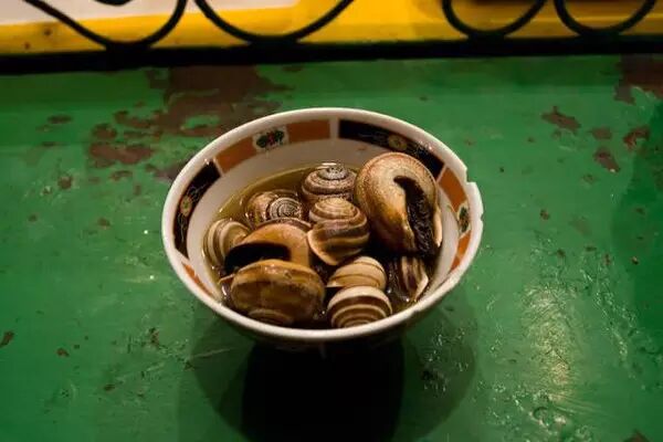 法国大餐里的蜗牛,在摩洛哥也是非常受欢迎的市井寻常小吃,但做法跟法餐不同。摩洛哥式蜗牛加入十几种调味料后会用大锅煮,煮到香料都入了味,连同汤汁一起吮吸,有种草药味,吃起来有点儿像香菇。