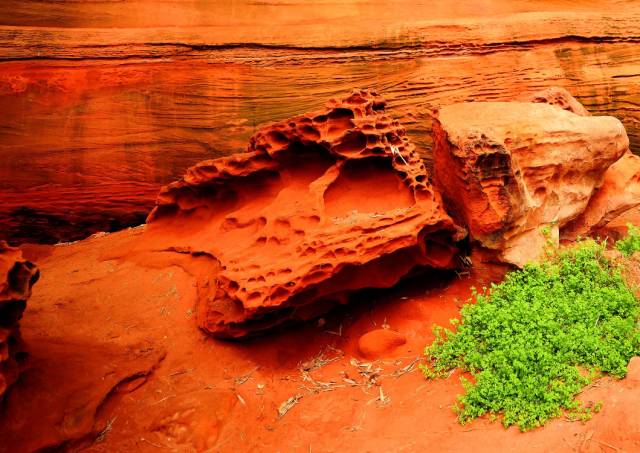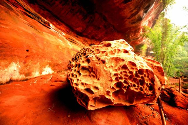 这里是一片红色蜂窝状丹霞壁画石刻长廊景观,千姿百态的红石气势磅礴,犹如一幅幅流动的“火焰画”,让你不由得感叹大自然的惊人造化!