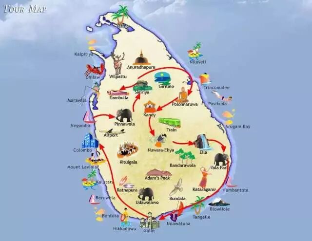 斯里兰卡在地图上形如水滴,也有人说她是散落的菩提叶。无论你来这里为了寻找什么风景,带走的都是最美的回忆。 尼甘布 Negombo 相比科伦坡的嘈杂和繁华,尼甘布要显得安静也落后得多。没有汽车呼啸而过,没有漫天的灰尘,旅馆就建在沙滩边,出门就是海,尽管这里的海水并不湛蓝,沙滩也并不细腻洁白,但开阔、宁静。 喜欢热闹和体验当地多彩的风情,建议在尼甘布沙滩公园加入本地人的行列中嬉戏玩耍。尼甘布沙滩的日落和晚霞不可错过。来这里拍下一张市集繁忙的人,感受当下。 狮子岩 Sigiriya 狮子岩它被誉为世界第八大奇迹,是斯里兰卡“文化金三角”的顶点,并且也是受到联合国教科文组织保护的世界级珍贵遗产,让每位初到的游客瞠目结舌、大叹神奇。最初巨岩被修建得如同一头巨大的狮子模样,如今只剩下狮身,狮头早已风化掉落。 狮子岩有两大看点:一是通过螺旋型的楼梯欣赏世界著名的锡吉里耶“天使般的少女”壁画;二是攀登到顶峰,看落日的余晖洒满土地。 康提 Kandy 康提古城,以佛教圣地闻名于世。美丽的康提湖,神秘的佛牙寺,都是最美的风景。康提的佛牙寺为著名的历史建筑物,也是佛教徒的朝圣之地。著名的佛牙寺供奉着佛祖释迦牟尼的牙齿,是斯里兰卡的国宝,每年都会有一次佛牙节,是世界上最丰富多彩的活动之一。 到康提的佛牙寺里去看看朝拜的场景,你会明白,斯里兰卡人民那发自内心的友善与慈悲,或许正是来自于这份最真的虔诚。 米瑞莎 Mirissa Beach 在斯里兰卡南部的海滨中,米瑞莎是最晚开放的一批,所以现在你还可以看到海滩上的大片椰林,开发项目还没有过多的影响这里的自然风光。 这里海水非常清澈,海岸近处的礁石是浮潜的好地方。在这里你可以看到高跷渔钓,可以海上冲浪,还可以出海寻找鲸鱼和海豚。 火车路线 Train 斯里兰卡被诸多旅游杂志誉为“拥有世界最美火车线的国家”。其中有两条必游的火车路线。 一段是“漂浮”于大海之上的“海上火车”——加勒海上线,有着犹如电_影一般的梦幻场景,《千与千寻》的真实版。 另一段是穿梭在康提茶园的“高山火车”,也是世界上最慢的火车之一,慢到让你不会在意时间的流逝,而是尽情的享受。当火车进入雾气缭绕的山区,窗外是一片片整齐的茶园,这里没有浮华也没有喧闹。 Mackwoods茶厂 Mackwoods茶厂是努沃勒埃利耶最出名的茶厂,也是斯里兰卡最大最著名的茶厂之一。 这个品牌的高山红茶已有160年的历史,它所拥有的茶园范围共有好几个山头。 可以到茶园参观,了解茶叶制作过程。品位地道的红茶,再配上一块巧克力蛋糕,快活似神仙。 加勒古城 Galle Fort 加勒是斯里兰卡南部海滨城市,它出名并不是由于海滩,而是城堡,他们已经被列入世界文化遗产。在荷兰殖民时期,荷兰人为了显示在斯里兰卡统治坚不可摧,在加勒建立了一座占地36万平方米的城堡,标准的欧洲风格。